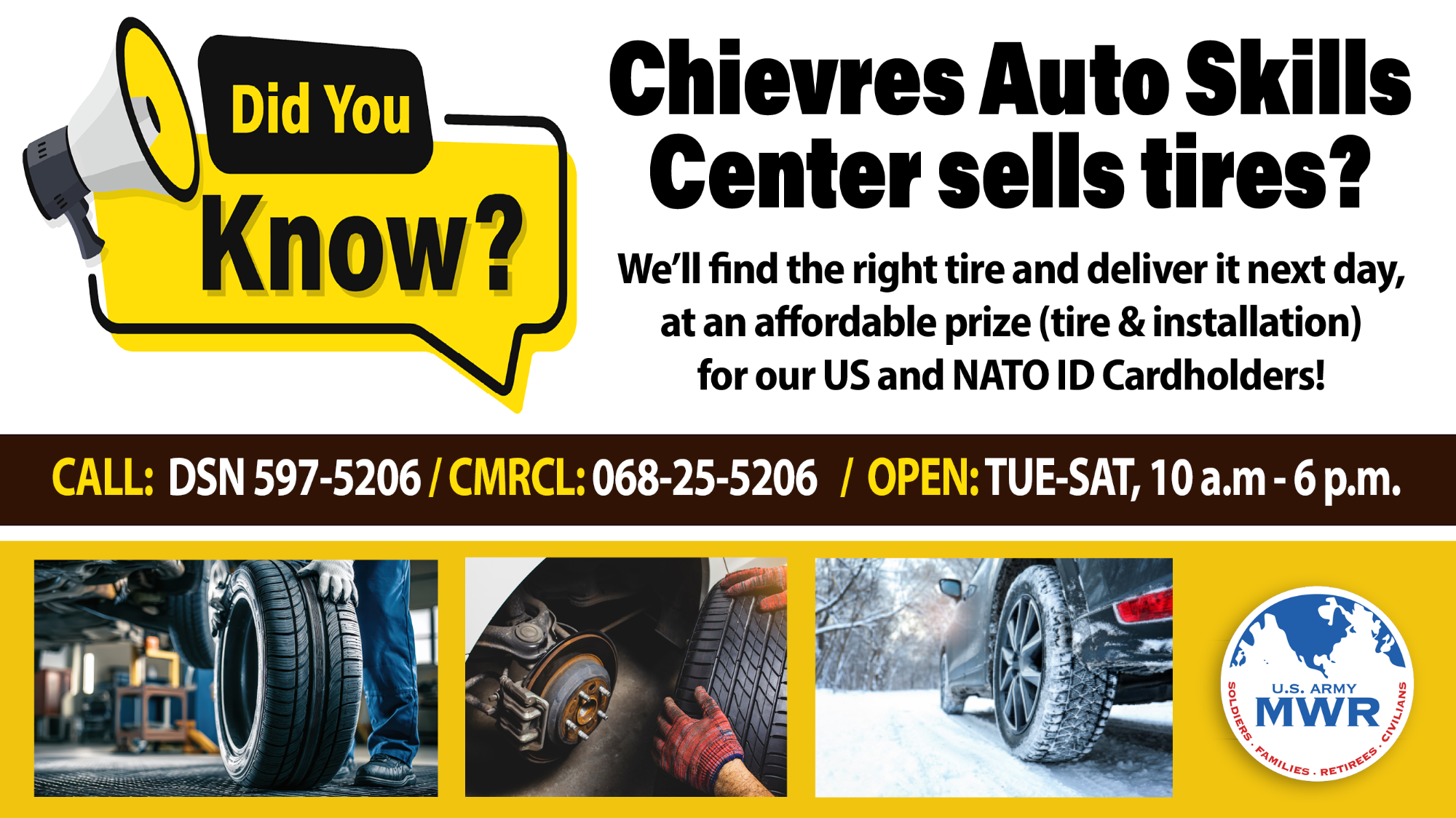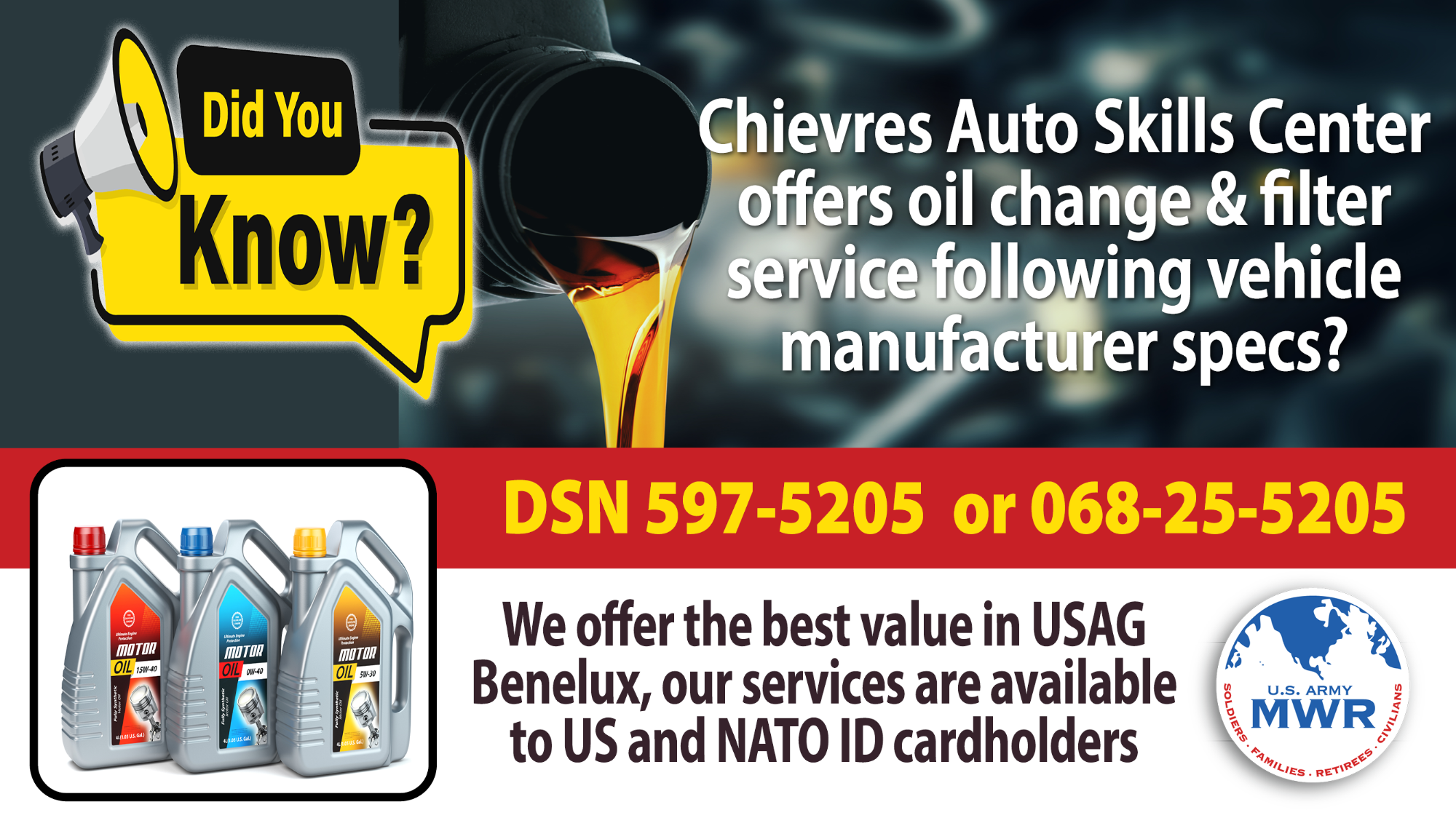 The Chievres Auto Skills Center, recipient of the 2019 Excellence in Army Recreation - Automotive Skills small garrison award, is your resource for maintaining your vehicle, making minor and major repairs, or restoring that classic in the garage. Family and MWR’s Automotive Skills Program offers a modern working environment complete with individual work bays, state-of-the-art mechanical tools, and a team of qualified and trained staff ready to help.