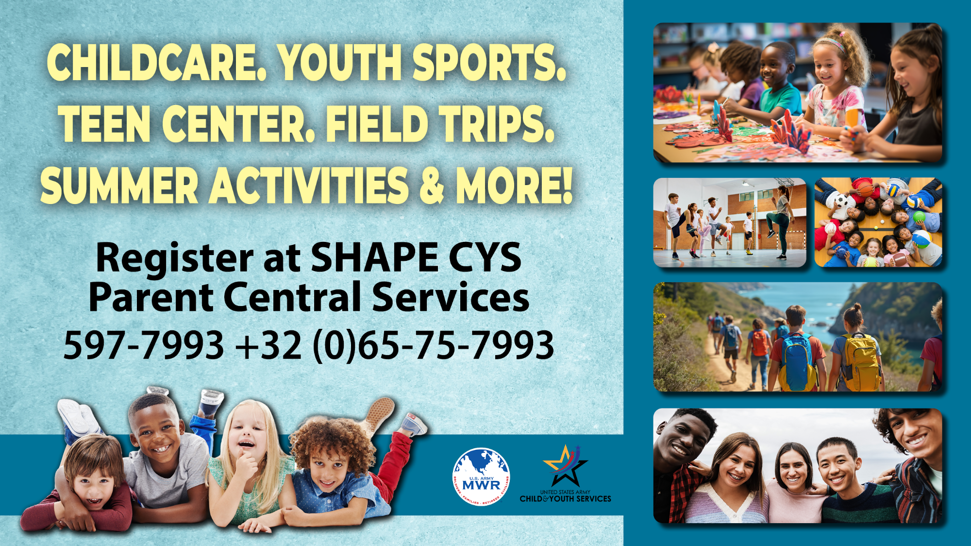 Child & Youth Services offers services to SHAPE members as defined in the SHAPE Directive 40-9. To verify eligibility, please visit CYS Parent Central Services. We look forward to fulfilling your child care needs as well as offering sports and fitness programs, instructional classes, camps, and open recreation activities for your child/youth based upon space availability.